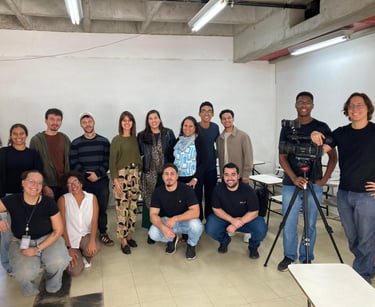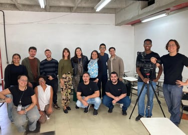 Registro do encontro com estagiários do Letss e participantes de edições anteriores do Programa de Educação para Aposentadoria durante a gravação realizada pela TV UFMG sobre as atividades do laboratório.